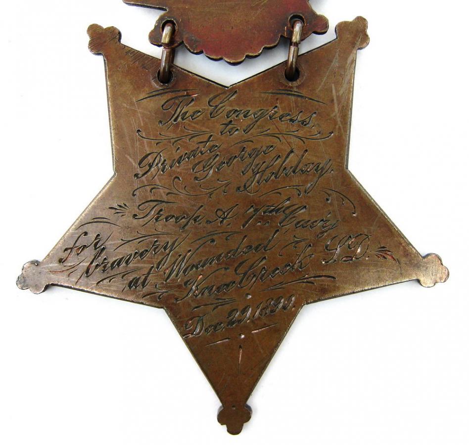 [1] Chelsea Military Antiques, The London Medal Company, http://www.london-medals.co.uk/the-historically-important-controversial-united-states-of-america-indian-wars-medal-of-honor-awarded-to-pte-george-hobday-a-co-7th-cavalry-united-states-army-for-bravery-at-the-battle-of-wounded-knee-creek-on-29th-dec-1890-displaying-conspicuous-gallant-c accessed 13 Sep 2013.