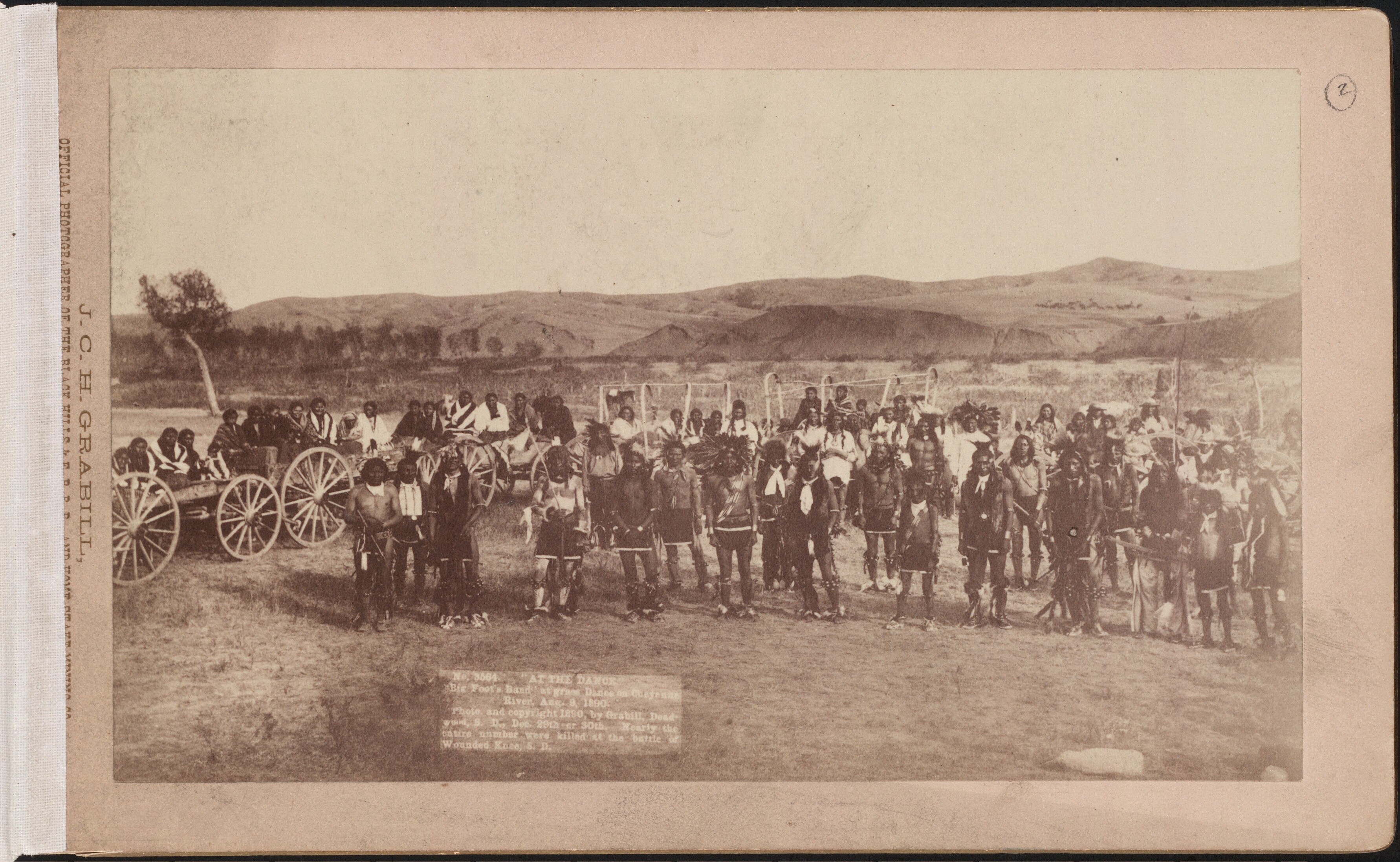 Photographer John C. H. Grabill, who captured the image of the majority of officers that fought at Wounded Knee, also captured the image of Chief Spotted Elk, commonly known as Big Foot, and his band of Miniconjou Lakota a few months prior to the majority of that clan falling to the guns of the 7th Cavalry and 1st Artillery. Grabill labeled the photograph, “At the Dance: Bigfoot’s Band at grass Dance on Cheyenne River, Aug. 9, 1890. Photo and copyright 1890, by Grabill, Deadwood, S. D., Dec. 29th or 30th. Nearly the entire number were killed at the battle of Wounded Knee, S. D.”[1]