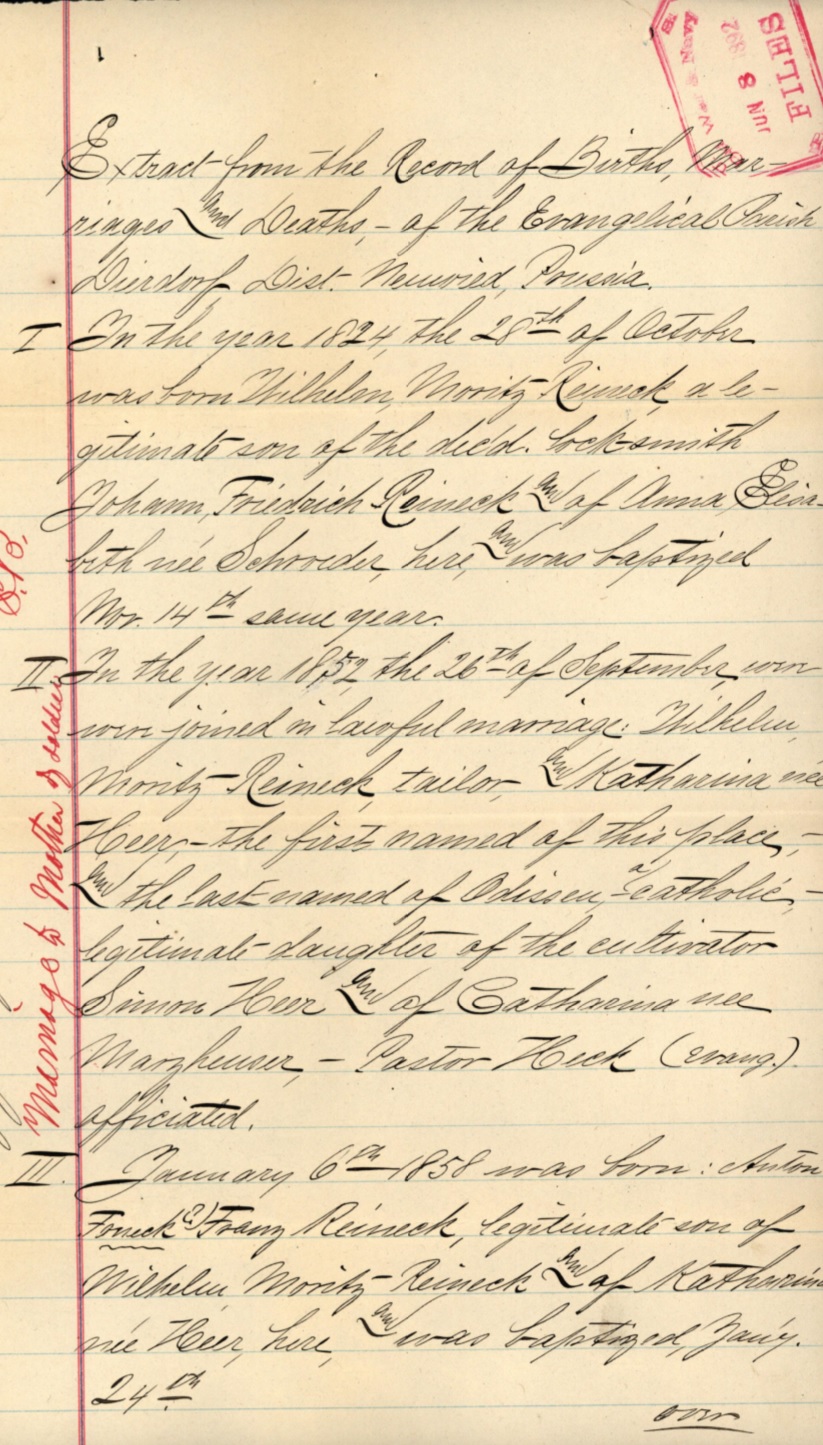 The Evangelical Parish of Dierdorf, Prussia listing Franz Anton the son of Wilhelm Moritz Reineck and Katharina Heer.[4]