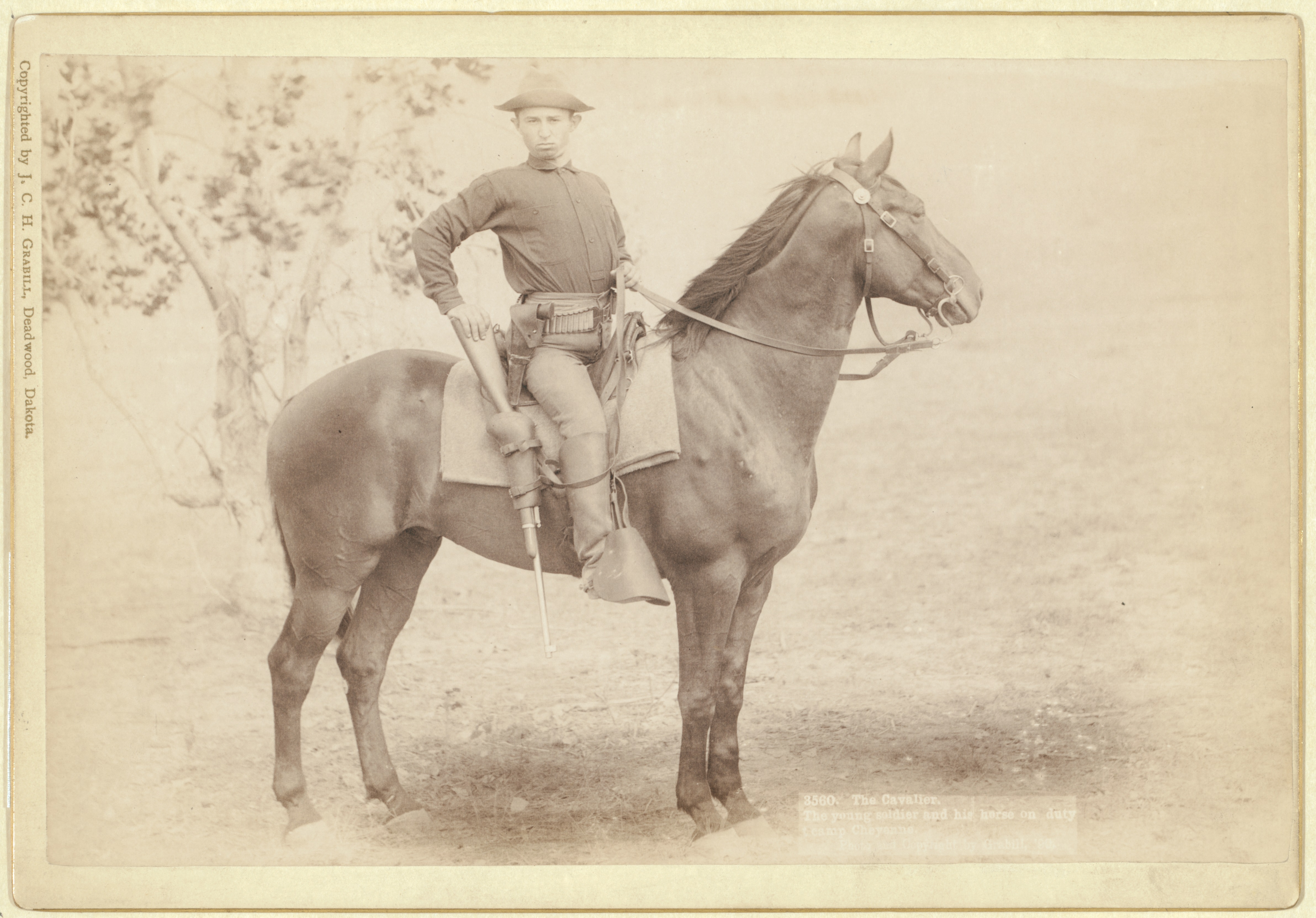 “The Cavalier. The young soldier and his horse on duty at camp Cheyenne,” by J. C. H. Grabill, 1890, Deadwood, Dakota. Privates in the 7th cavalry at Wounded Knee were equipped like the trooper pictured.