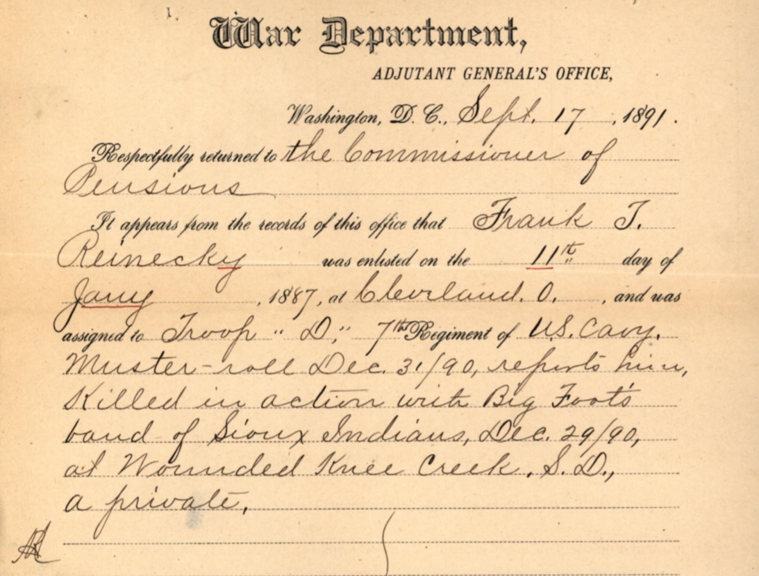 Letter from the War Department to the Commissioner of Pensions verifying that Private Frank T. Reinecky was killed at Wounded Knee.[7]