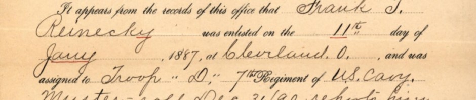 Abandoning the life of a butcher, Frank T. Reineck, enlisted 11 January 1887 at Cleveland, Ohio. His recruiting officer, Lt. Vernon, recorded his name as Reinecky and signed him up for five years in the cavalry. Stating that he was twenty-seven years of age, two less than actual, Frank Reinecky also stated that he was born at Long Island, N. Y, rather than his native Dierdorf, Germany. He had blue eyes, blond hair, a fair complexion, and stood five feet, seven and a half inches in height. Reinecky was assigned as a private in Captain Godfrey’s D Troop, 7th Cavalry.[6]