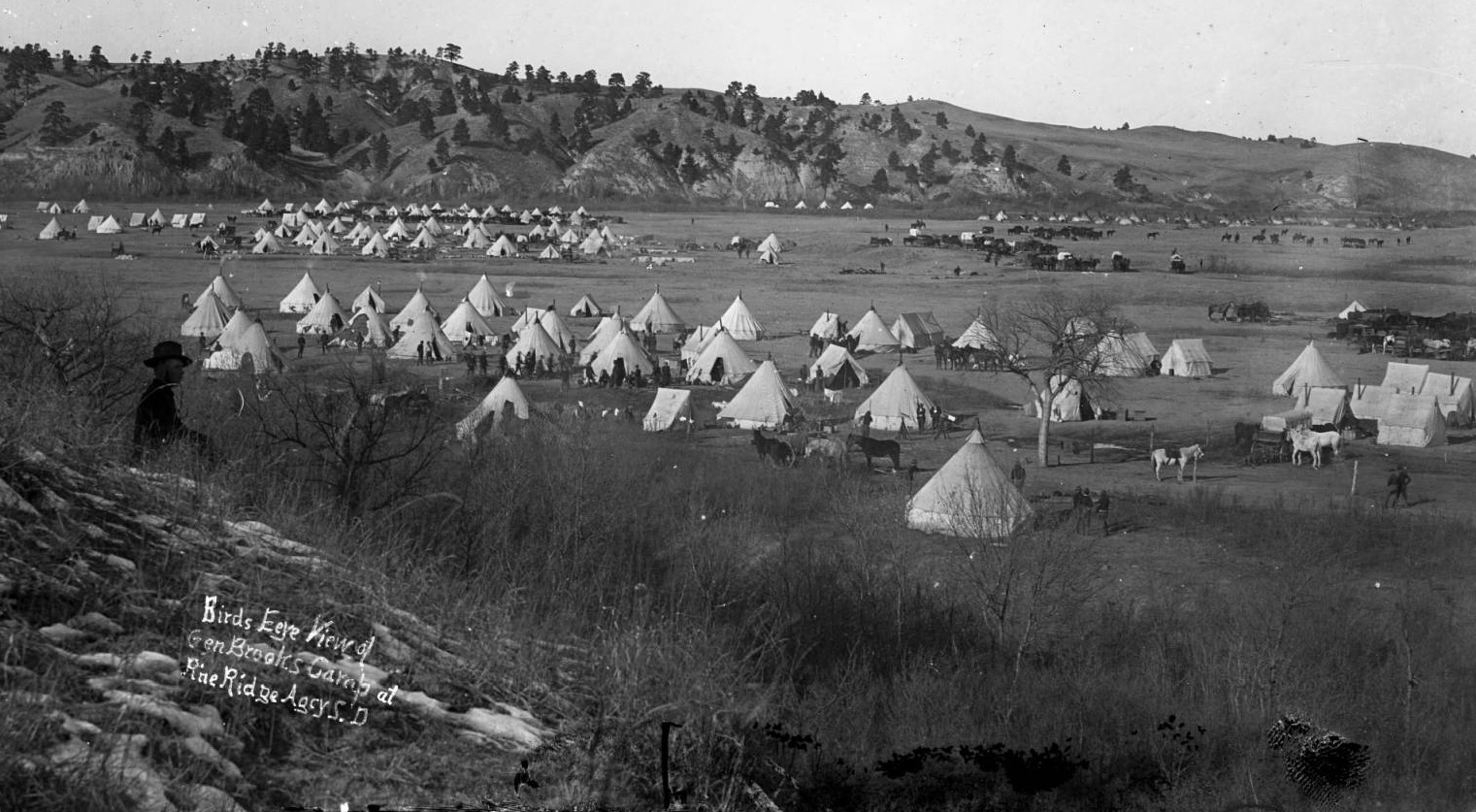 “Birds Eye View of Gen Brooks Camp at Pine Ridge Agcy S. D.” from the Denver Public Library Digital Collections. The view includes the camp of the 2nd U.S. Infantry Regiment.