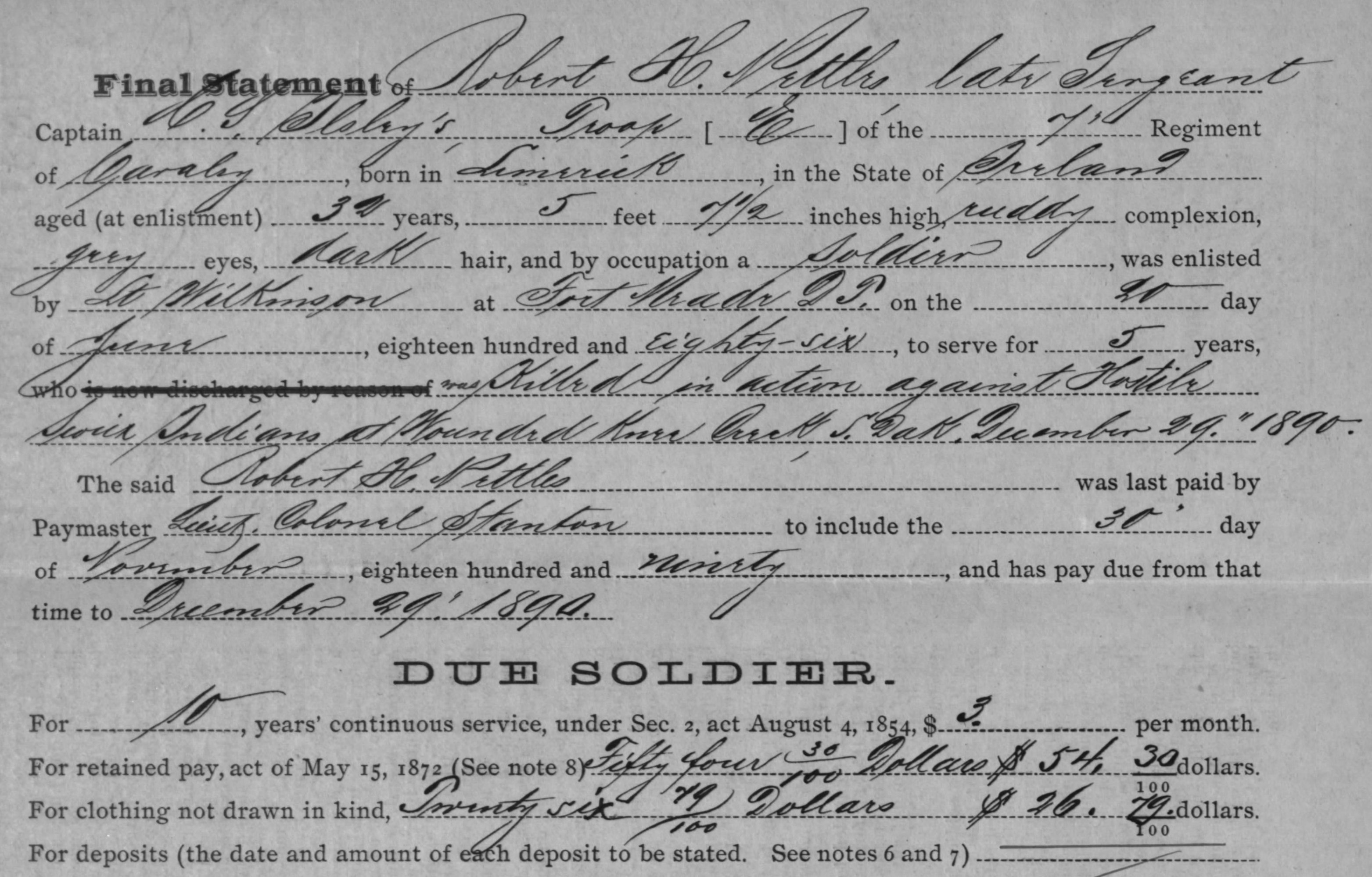 Citation for this article: Samuel L. Russell, “Irish Immigrant Sergeant Robert H. Nettles, E Troop, 7th Cavalry – Killed in Action,” Army at Wounded Knee (Sumter, SC: Russell Martial Research, 2013-2015, http://wp.me/p3NoJy-Di), posted 7 Dec 2014, accessed date __________.