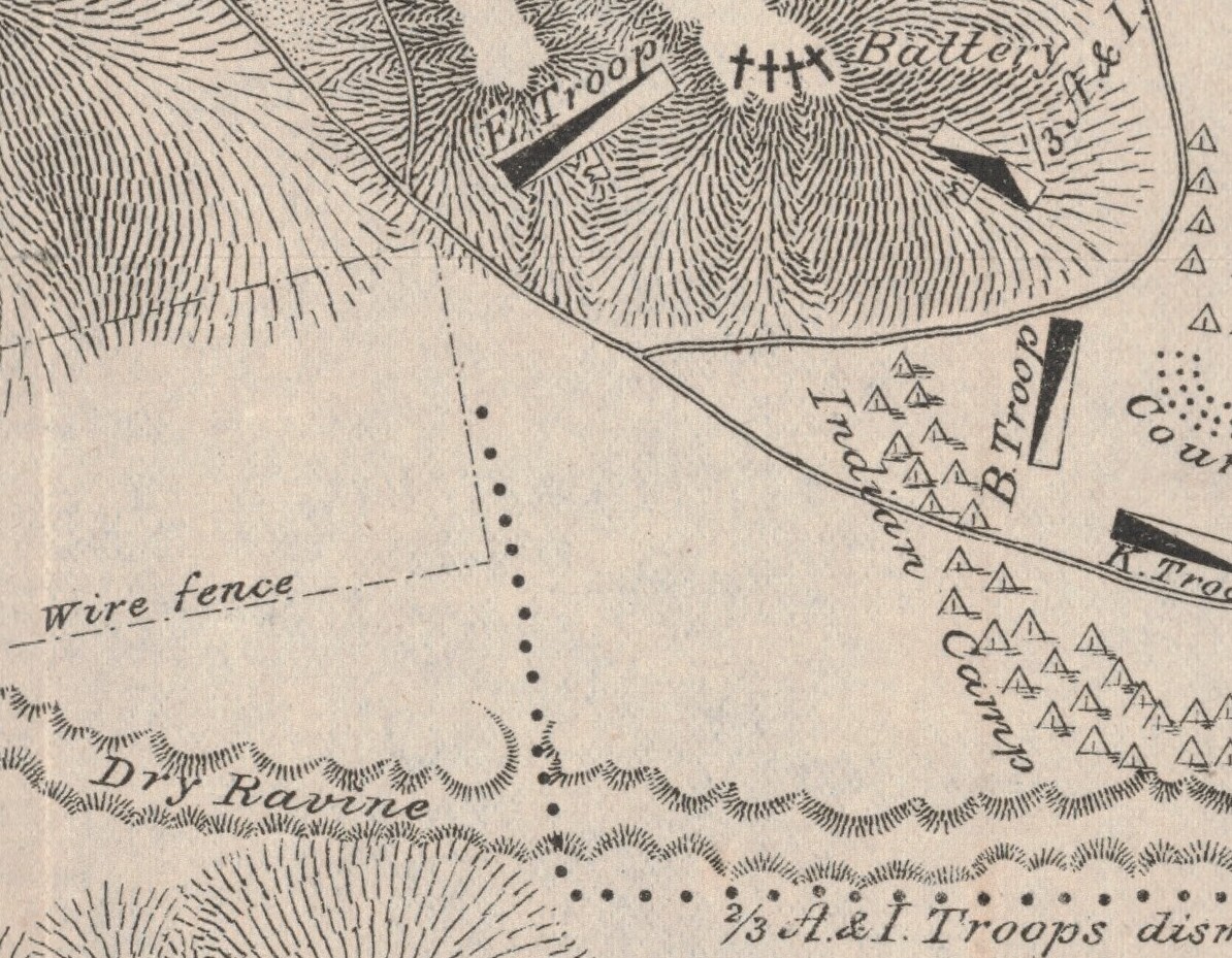 When the fight commenced, our Troop E, was in a position on a hill on the right of the guns supporting the battery; we were mounted and faced the camp. The Indian herd and a great many squaws, who were most of them mounted and some in wagons, went up between us and the wire fence on the road. We immediately dismounted and deployed to fight on foot. Lieut. Sickel, who was in command of the Troop, and myself, gave repeated orders to the Troop not to shoot at these Indians, because they were women and children, but to direct their fire on the herd of ponies. Our orders were obeyed. One of these mounted squaws was armed and fired on our line, and one of the men said then “There is a buck.” And I said “No, it is a squaw, don’t shoot on her,” and he said “Well, by God, Lieut., she is shooting at us.” He did not fire at her. Immediately after that I got an order to take my platoon and go up and clear out the ravine. I went up dismounted in a skirmish line to the right, and struck the ravine above the place marked “Pocket” on the map submitted, and worked down the ravine towards camp. On my way up the ravine to the position described, I saw a number of killed and wounded Indians, who were principally bucks. After the fight was over, I was ordered up with E Troop to pick up our dead. I met two Indians scouts and showed them where the killed and wounded Indians were, as far as possible. There was one wounded squaw there, who had cut her own throat and who was in the last throes of death when I went up to her; my men picked up two Indian children, who were alive, unhurt, and I turned them over to the Indian scouts with orders to turn them over to the Indian women captives.[4]