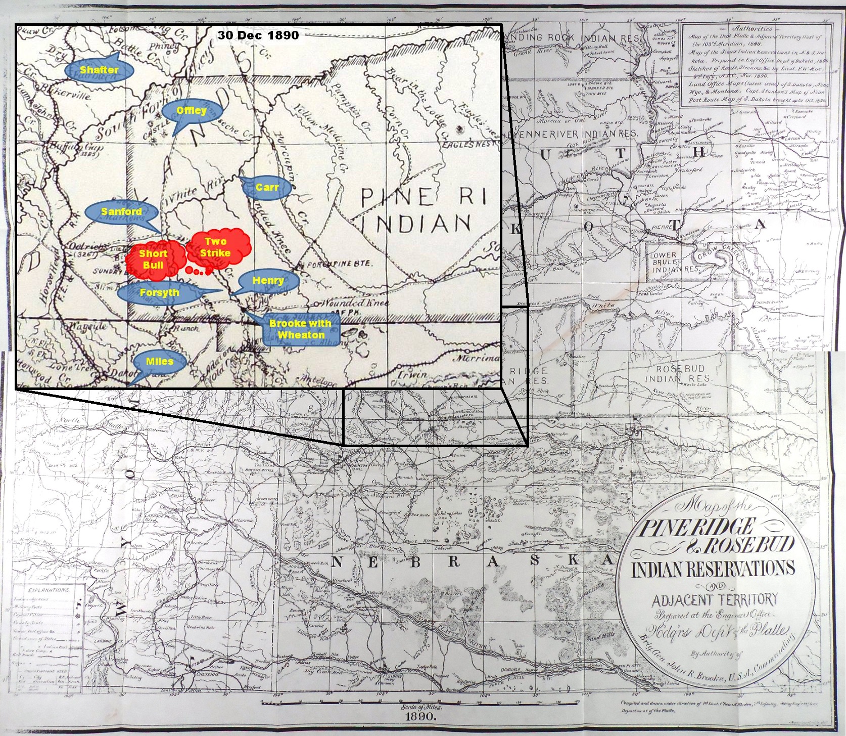 (Click to enlarge) Inset depicting approximate location of U.S. troops and Indian bands as Col. Forsyth conducted a reconnaissance to the Catholic Mission on White Clay Creek on 30 Dec. 1890.