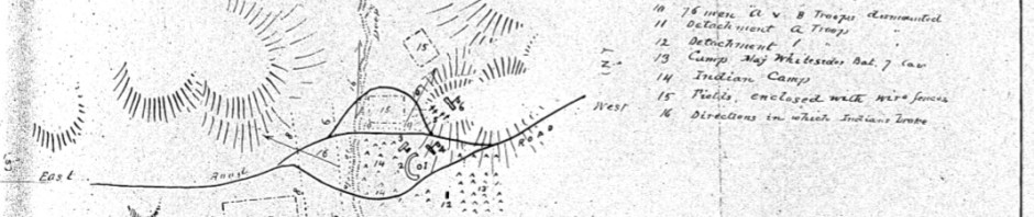 (Click to enlarge) Map furnished by Col. Forsyth, 7th Cavalry, of action of 29 December 1890. Forsyth incorrectly annotated North at the bottom of the page. It more accurately should be on the right side of the page.