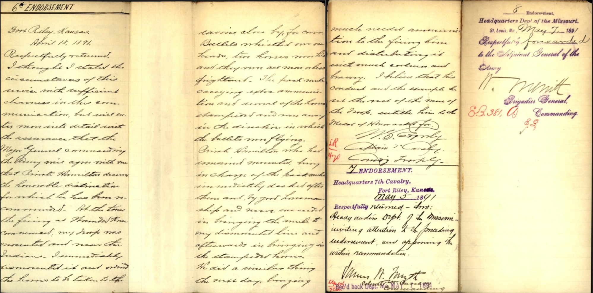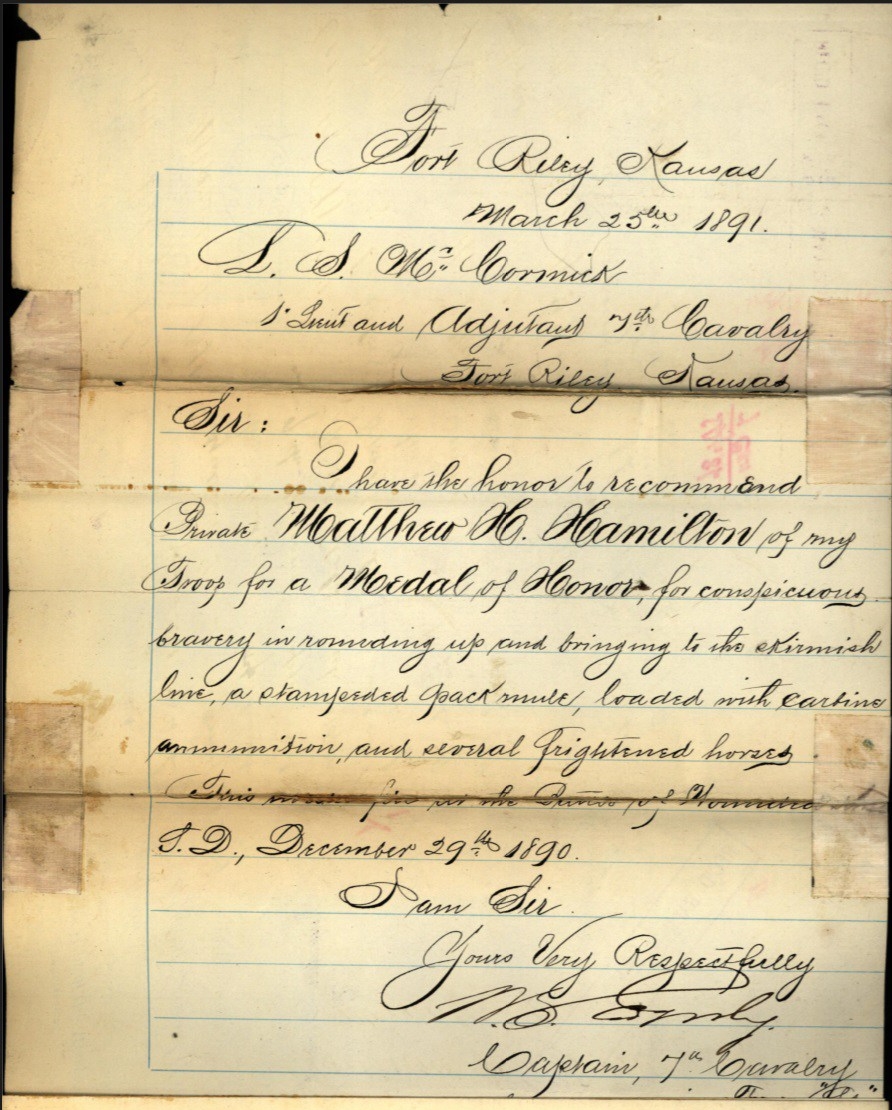 Respectfully returned. I thought I stated the circumstances of this service with sufficient clearness in this communication, but will enter more into detail with the assurance that the Major General commanding the Army will agree with me that Private Hamilton deserves the honorable distinction for which he has been recommended. At the time the firing at Wounded Knee commenced, my Troop was mounted and near the Indians. I immediately dismounted it and ordered the horses to be taken to the ravine close by, for cover.