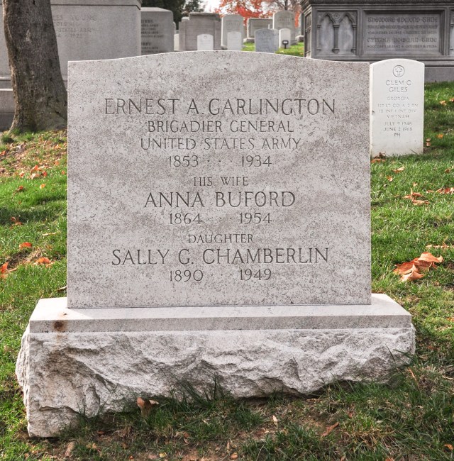 Brigadier General Ernest A. Garlington is buried with his wife, Anna Buford, and daughter, Sally Chamberlain, at Arlington National Cemetery.[31]