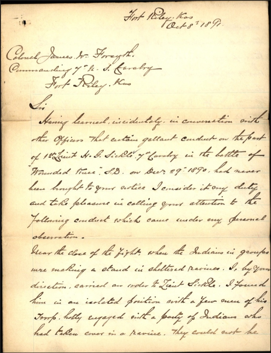 Sir: Having learned, incidentaly [sic], in conversation with other officers that certain gallant conduct on the part of 1st Lieut. H. G. Sickle [sic], 7th Cavalry in the battle of “Wounded Knee,” S. D., on Dec. 29th, 1890, had never been brought to your notice I consider it my duty and take pleasure in calling your attention to the following conduct which came under my personal observation.