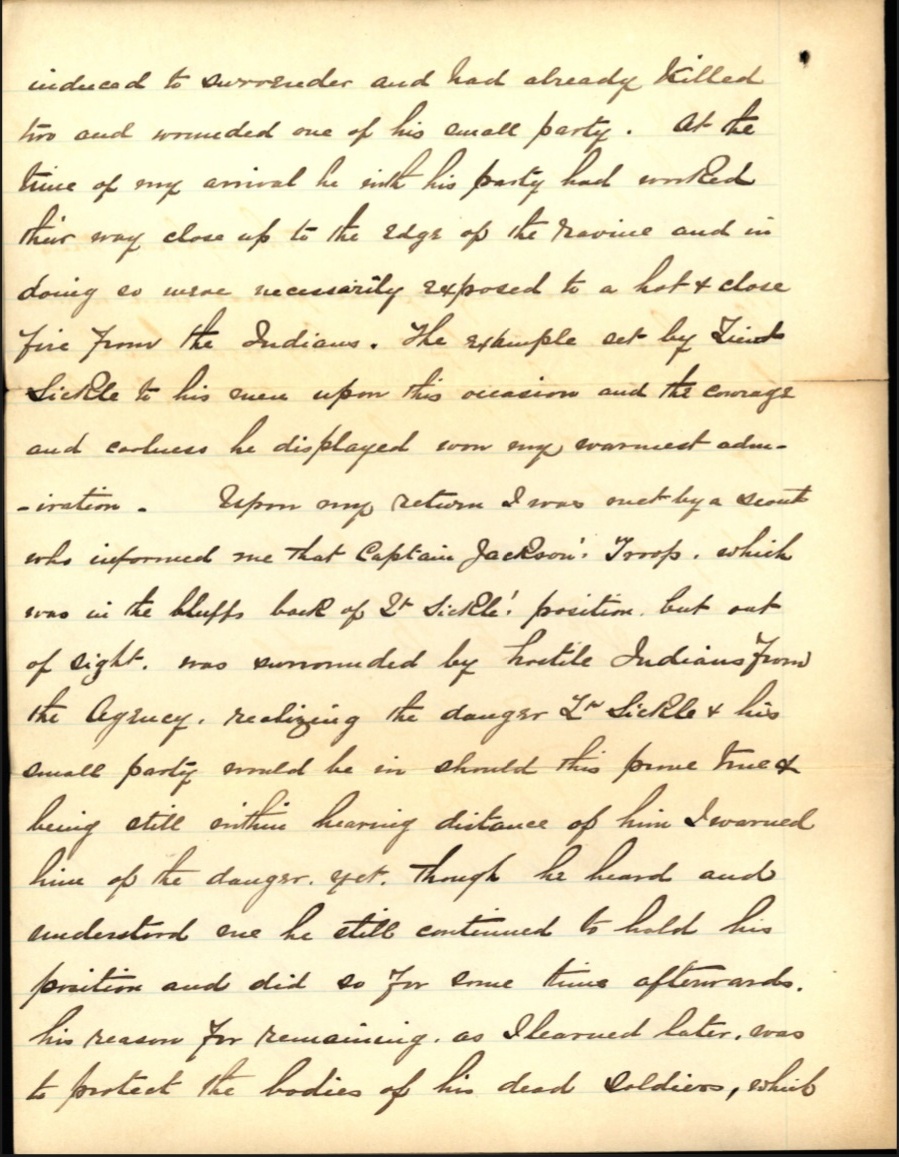 induced to surrender and had already killed two and wounded one of his small party. At the time of my arrival he with his party had worked their way close up to the edge of the ravine and in doing so were necessarily exposed to a hot & close fire from the Indians. The example set by Lieut. Sickle to his men upon this occasion and the courage and coolness he displayed earn my earnest admiration. Upon my return I was met by a scout who informed me that Captain Jackson’s Troop, which was in the bluffs back of Lt. Sickle’s position, but out of sight, was surrounded by hostile Indians from the Agency.  Realizing the danger Lt. Sickle & his small party would be in should this prove true & being still within hearing distance of him I warned him of the danger. Yet, though he heard and understood me he still continued to hold his position and did so for some time afterwards. His reason for remaining, as I learned later, was to protect the bodies of his dead soldiers, which