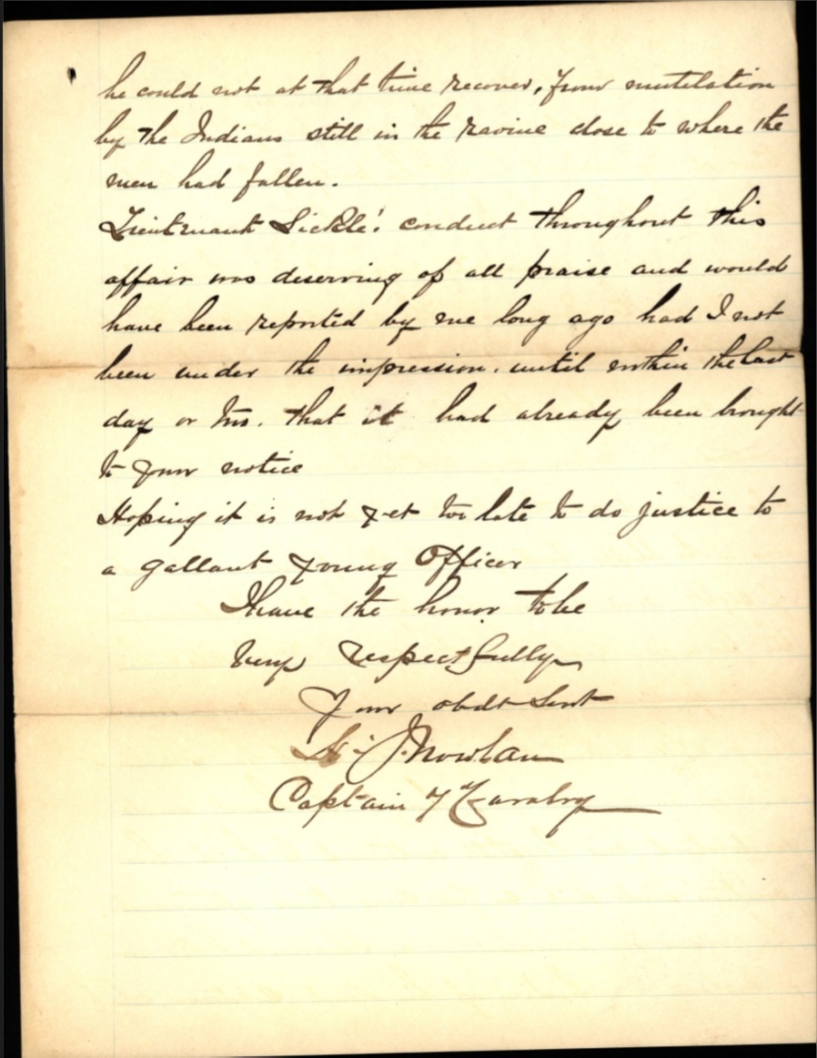 Near the close of the fight, when the Indians in groups were making a stand in sheltered ravines, I, by your direction, carried an order to Lieut. Sickle. I found him in an isolated position with a few men of his Troop, hotly engaged with a party of Indians who had taken cover in a ravine. They could not be