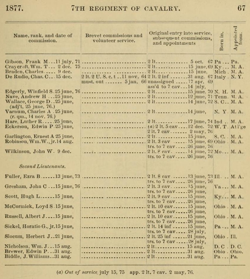 [11] Association of Graduates, Sixtieth Annual Reunion of the Association of the Graduates of the United States Military Academy, June 12, 1929 (West Point: Association of Graduates, 1929), 231.  Herbert J. Slocum was a member of the West Point class of 1876, but was dismissed from the academy for academic deficiency during his final year.  He received a direct appointment from the state of Illinois on 21 June, just a week after his former classmates had graduated and received their commissions.  Originally appointed to the 25th Infantry Regiment, his date of transfer to the 7th Cavalry was 28 June 1876.
