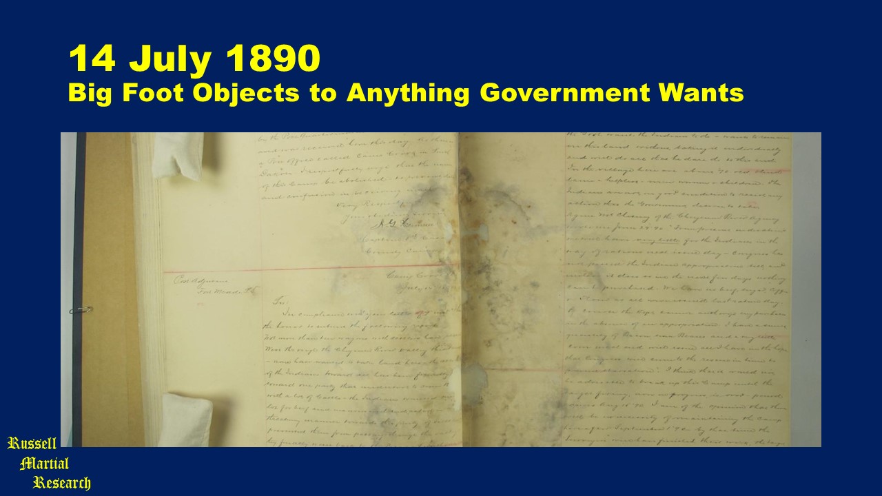 Based now on his own observations, Capt. Hennisee reported on 14 July 1890 that “‘Big Foot’ objects to almost anything that the Government wants the Indians to do.”