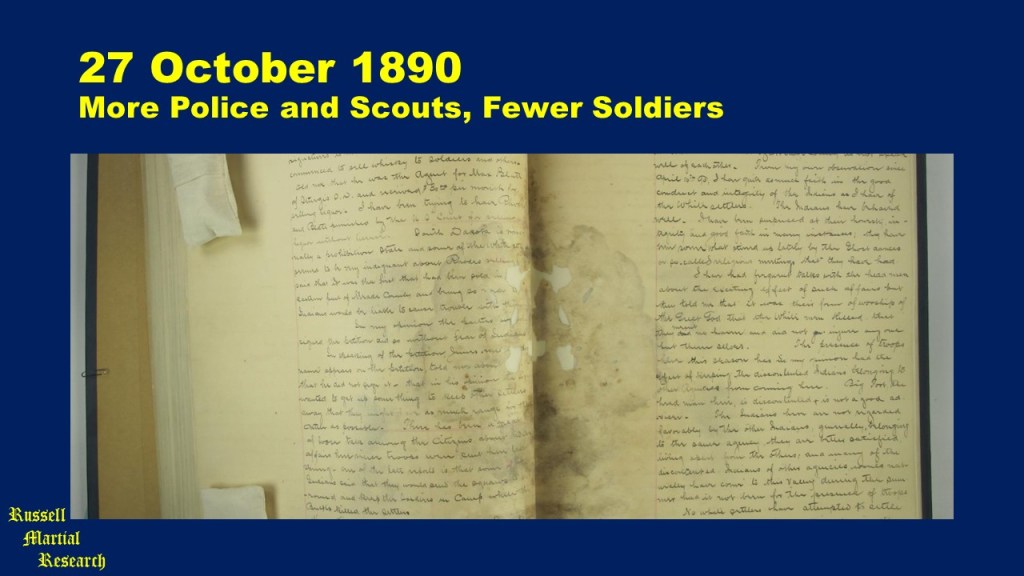 Since arrival here April 5th ‘90, the Indian Police have managed every case requiring action among the Indians, the troops have taken no action whatever in any case. There are about fifteen Indians belonging to Big Foot’s band, who would make reliable and efficient scouts. The pay and allowances as scouts during the coming Winter would go very far toward their support, comfort and contentment would be beneficial to the Indians in many ways and be a judicious expenditure for the Government.