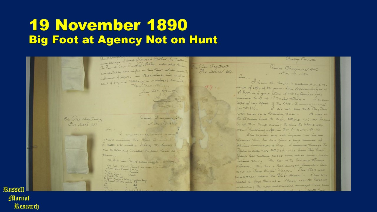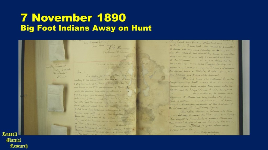 Capt. Hennisee on 19 November 1890, had to clear up with his higher headquarters some confusion on Big Foot’s whereabouts, as opposed to his band, that he detailed in his earlier letter to the department headquarters. He also detailed that the hunting party conducted Ghost Dances regularly while in the Black Hills.