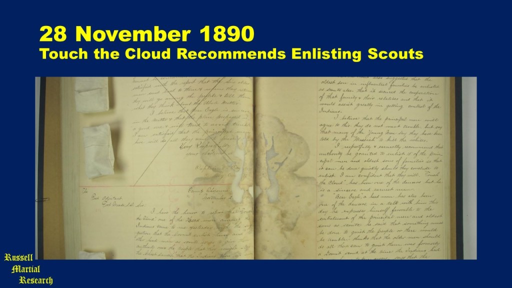 On 28 November 1890, Capt. Hennisee reported that Touch the Cloud recommended enlisting him and other head men as scouts. Of note is that by this date, the military campaign was well underway with troops arriving daily at the Pine Ridge and Rosebud reservations.