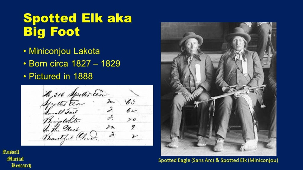 (Click to enlarge) Slides in this essay are unaltered from the author’s September 2024 presentation to the Order of the Indian Wars (OIW). The picture on the left is from the 1890 Indian Census of Cheyenne River Agency taken at the beginning of July that year. The picture on the right is from Smithsonian Photographer Thomas Smillie.