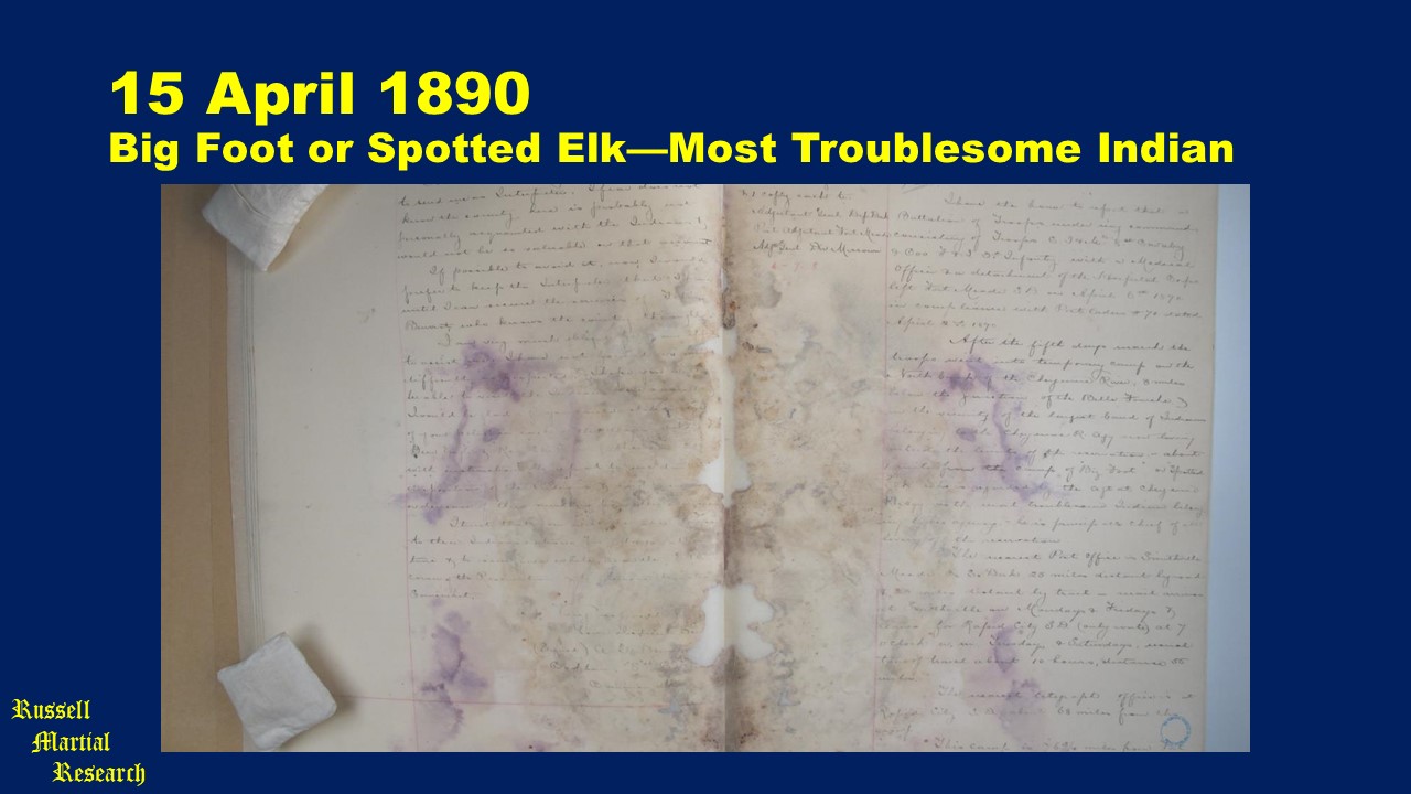 Each military post, whether a permanent fort or a temporary field camp, was required to maintain records pertinent to that post. The observations or reports contained in this essay come from the ‘Letters Sent’ file for the Camp on Cheyenne River. They are contained in one logbook consisting of over 200 letters spanning 164 pages. In the book are certified copies of every letter sent by the post’s commander or adjutant on behalf of the commander. The letters date from 7 April 1890 to 22 February 1891. Most of the letters are signed by Captain Hennisee for the first eight months, up to the point that Lt. Col. Edwin V. Sumner, Jr., also of the 8th Cavalry, assumed command of the post in the first week of December 1890 as events of that winter campaign began to escalate. The majority of the letters deal with the day-to-day administration of operating a camp in the field. Presented here are fourteen of the letters that deal specifically with Big Foot’s band or relevant events regarding the Indians who lived along the Cheyenne River off of the reservation proper.5 All of these letters were signed by Capt. Hennisee, and, unless stated otherwise, were sent to his higher headquarters at Fort Meade, S. Dak. The log itself has undergone extensive deterioration in 130 years, likely having been subjected to moisture at some point in the archives. Presented here and on subsequent slides are images of the actual pages from the log of each of the letters presented. Much of the pages are unreadable with portions of the pages missing. I have made the best possible transcription of each page, but some of the text in the log are lost to history. These letters are significant because they are not otherwise contained in the National Archives compilation of correspondence related to the Wounded Knee investigation and the Sioux Campaign of 1890-1891.