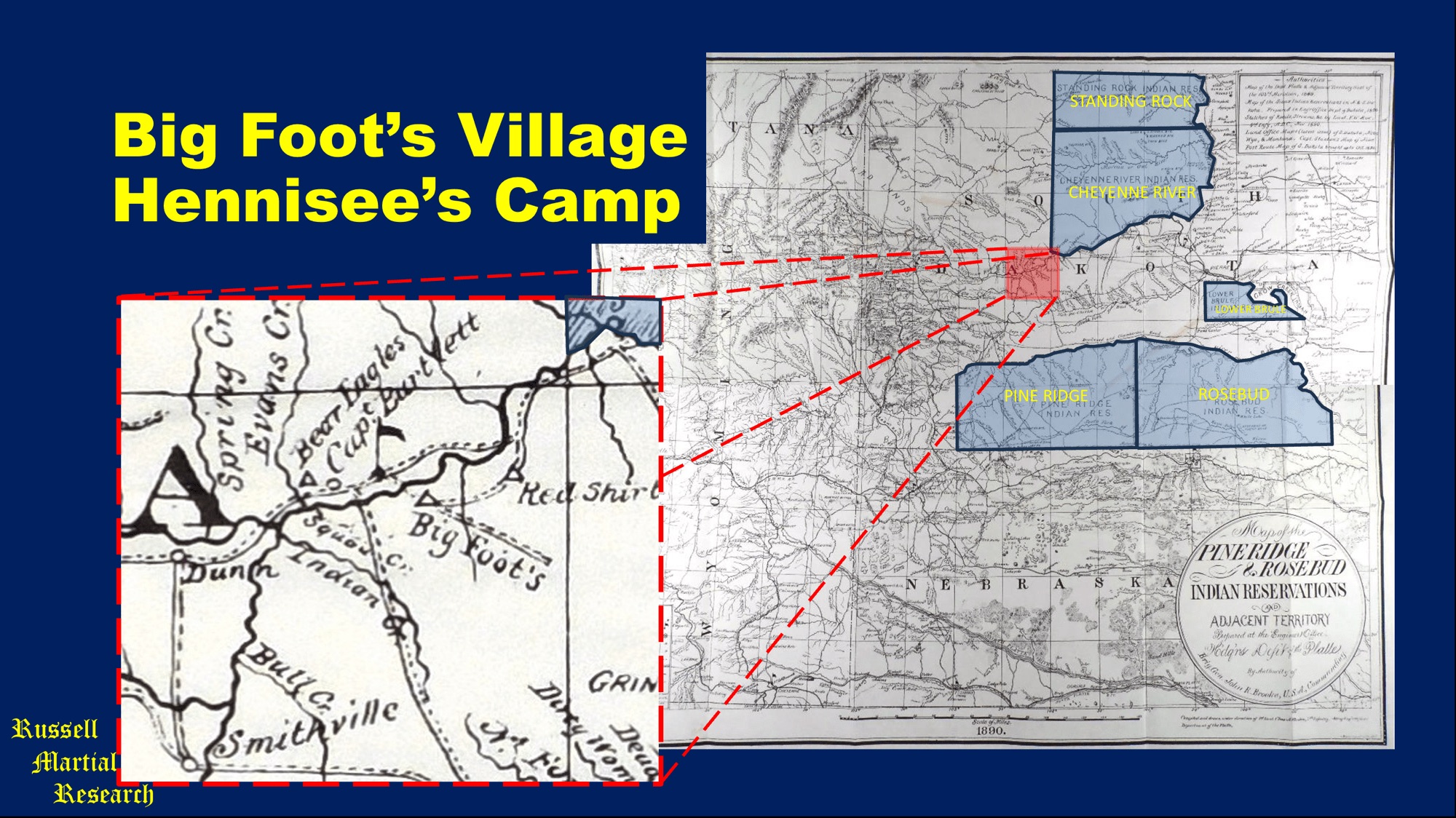(Click to enlarge) The inset of Brig. Gen. John R. Brooke’s campaign map details the location of Captain Hennisee’s camp in the vicinity of Big Foot’s village.