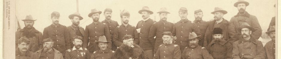 [3] Walter M. Camp, comp., “Walter M. Camp Photograph Collection,” Birgham Young University, http://contentdm.lib.byu.edu/cdm/singleitem/collection/Camp/id/270/rec/5 accessed 23 Aug 2013. Walter Camp provided the following identification on the back of John C. H. Grabill’s photopgraph “The Fighting 7th Offciers”: Standing- Lt. L.S. McCormick, Adjutant, 7th Cavalry; Lt. Maxfield, Signal Officer; Lt. W.S. Scott, 1st Cavalry; Lt. William J. Nickolson, 7th Cavalry; Lt. S. Rice, 7th Cavalry; Lt. T.Q. Donaldson, 7th Cavalry; Lt. Franklin Bell, 7th Cavalry; Lt. H.G. Squires, 7th Cavalry; Lt. E.P. Brewer, 7th Cavalry; Lt. E.B. Fuller, 7th Cavalry; Lt. H.G. Sickle, 7th Cavalry; Doctor LeMay, Veterinary Corps; Lt. Selah R.H. Tompkins; Sitting- Captain W.S. Edgerly, 7th Cavalry; Captain C.S. Illsley, 7th Cavalry; Lt. H.H. Wright, 9th Cavalry; Captain Charles A. Varnum, 7th Cavalry; Colonel James W. Forsythe, C. O. 7th Cavalry; Major Samuel M. Whitside, 7th Cavalry; Captain M. Moylan, 7th Cavalry; Captain E.S. Godfrey, 7th Cavalry; Captain Van Hoff, (Doctor); and Lt. J.C. Gresham, 7th Cavalry.