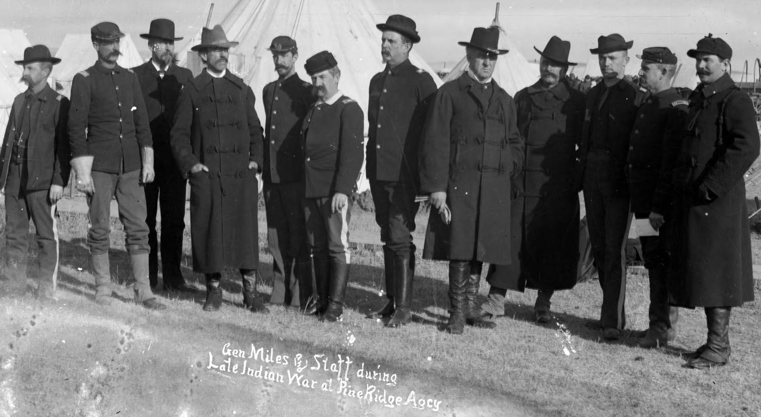 George E. Trager’s “Gen Miles and Staff during Late Indian War at Pine Ridge Agcy,” January 13, 1891. From left to right are Captain Ezra P. Ewers, Lieutenant John S. Mallory, Captain Francis E. Pierce, Lieutenant Colonel Dallas Bache, Captain Francis J. Ives, Major Jacob Ford Kent, Lieutenant Colonel Henry C. Corbin, Major General Nelson A. Miles, Captain Frank D. Baldwin, Lieutenant Sydney A. Cloman, Captain Charles F. Humphrey, and Captain Marion P. Maus. General Miles was the commanding general of the Division of the Missouri.[20